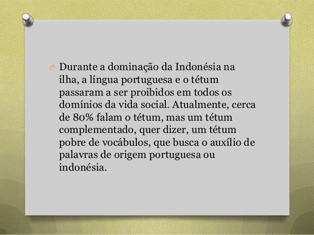 45. 45. O Durante a dominação da Indonésia na ilha, a língua portuguesa e o tétum passaram a ser proibidos em todos os domínios da vida social. Atualmente, cerca de 80% falam o tétum, mas um tétum complementado, quer dizer, um tétum pobre de vocábulos, que busca o auxílio de palavras de origem portuguesa ou indonésia.
