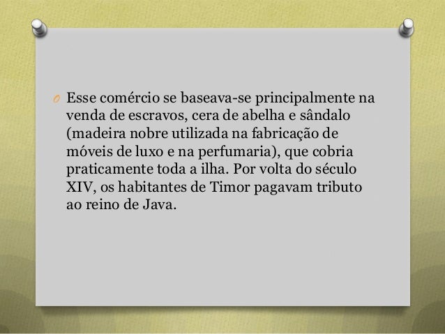 4. 4. O Esse comércio se baseava-se principalmente na venda de escravos, cera de abelha e sândalo (madeira nobre utilizada na fabricação de móveis de luxo e na perfumaria), que cobria praticamente toda a ilha. Por volta do século XIV, os habitantes de Timor pagavam tributo ao reino de Java.