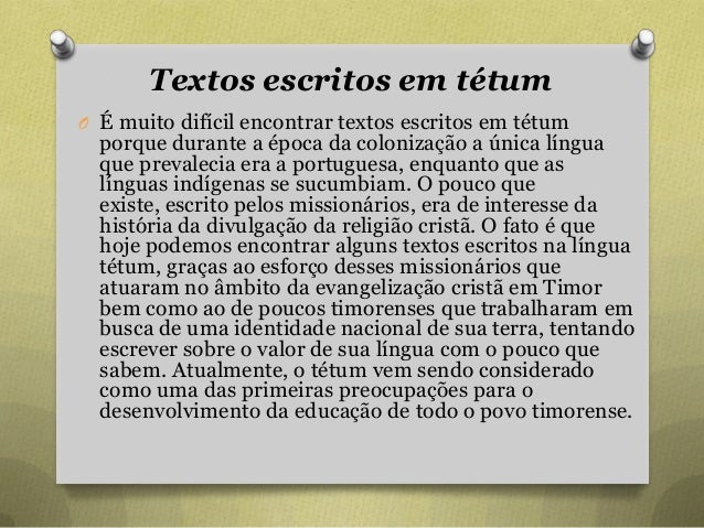 46. 46. Textos escritos em tétum O É muito difícil encontrar textos escritos em tétum porque durante a época da colonização a única língua que prevalecia era a portuguesa, enquanto que as línguas indígenas se sucumbiam. O pouco que existe, escrito pelos missionários, era de interesse da história da divulgação da religião cristã. O fato é que hoje podemos encontrar alguns textos escritos na língua tétum, graças ao esforço desses missionários que atuaram no âmbito da evangelização cristã em Timor bem como ao de poucos timorenses que trabalharam em busca de uma identidade nacional de sua terra, tentando escrever sobre o valor de sua língua com o pouco que sabem. Atualmente, o tétum vem sendo considerado como uma das primeiras preocupações para o desenvolvimento da educação de todo o povo timorense.