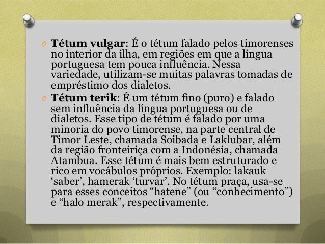 48. 48. O Tétum vulgar: É o tétum falado pelos timorenses no interior da ilha, em regiões em que a língua portuguesa tem pouca influência. Nessa variedade, utilizam-se muitas palavras tomadas de empréstimo dos dialetos. O Tétum terik: É um tétum fino (puro) e falado sem influência da língua portuguesa ou de dialetos. Esse tipo de tétum é falado por uma minoria do povo timorense, na parte central de Timor Leste, chamada Soibada e Laklubar, além da região fronteiriça com a Indonésia, chamada Atambua. Esse tétum é mais bem estruturado e rico em vocábulos próprios. Exemplo: lakauk „saber‟, hamerak „turvar‟. No tétum praça, usa-se para esses conceitos “hatene” (ou “conhecimento”) e “halo merak”, respectivamente.