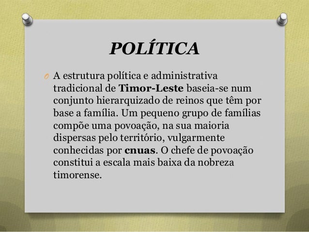 49. 49. POLÍTICA O A estrutura política e administrativa tradicional de Timor-Leste baseia-se num conjunto hierarquizado de reinos que têm por base a família. Um pequeno grupo de famílias compõe uma povoação, na sua maioria dispersas pelo território, vulgarmente conhecidas por cnuas. O chefe de povoação constitui a escala mais baixa da nobreza timorense.