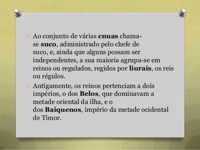 50. 50. O Ao conjunto de várias cnuas chama- se suco, administrado pelo chefe de suco, e, ainda que alguns possam ser independentes, a sua maioria agrupa-se em reinos ou regulados, regidos por liurais, os reis ou régulos. O Antigamente, os reinos pertenciam a dois impérios, o dos Belos, que dominavam a metade oriental da ilha, e o dos Baiquenos, império da metade ocidental de Timor.