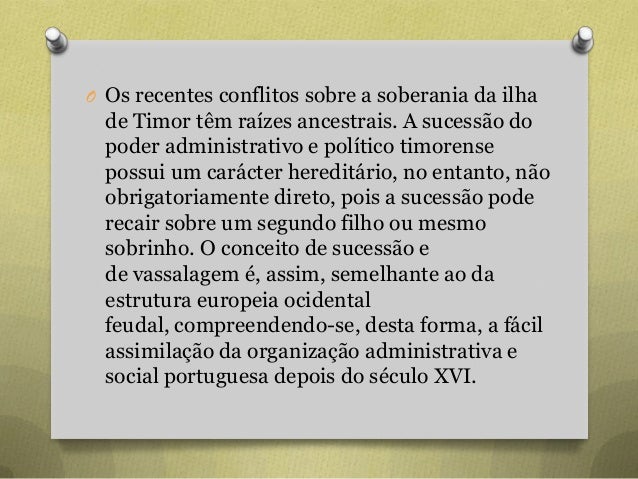 51. 51. O Os recentes conflitos sobre a soberania da ilha de Timor têm raízes ancestrais. A sucessão do poder administrativo e político timorense possui um carácter hereditário, no entanto, não obrigatoriamente direto, pois a sucessão pode recair sobre um segundo filho ou mesmo sobrinho. O conceito de sucessão e de vassalagem é, assim, semelhante ao da estrutura europeia ocidental feudal, compreendendo-se, desta forma, a fácil assimilação da organização administrativa e social portuguesa depois do século XVI.