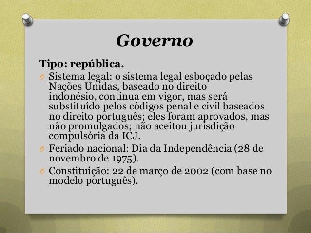 52. 52. Governo Tipo: república. O Sistema legal: o sistema legal esboçado pelas Nações Unidas, baseado no direito indonésio, continua em vigor, mas será substituído pelos códigos penal e civil baseados no direito português; eles foram aprovados, mas não promulgados; não aceitou jurisdição compulsória da ICJ. O Feriado nacional: Dia da Independência (28 de novembro de 1975). O Constituição: 22 de março de 2002 (com base no modelo português).