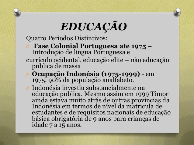 53. 53. EDUCAÇÃO Quatro Períodos Distintivos: O Fase Colonial Portuguesa ate 1975 – Introdução de língua Portuguesa e currículo ocidental, educação elite – não educação publica de massa O Ocupação Indonésia (1975-1999) - em 1975, 90% da população analfabeto. O Indonésia investiu substancialmente na educação publica. Mesmo assim em 1999 Timor ainda estava muito atrás de outras províncias da Indonésia em termos de nível da matricula de estudantes e de requisitos nacionais de educação básica obrigatória de 9 anos para crianças de idade 7 a 15 anos.