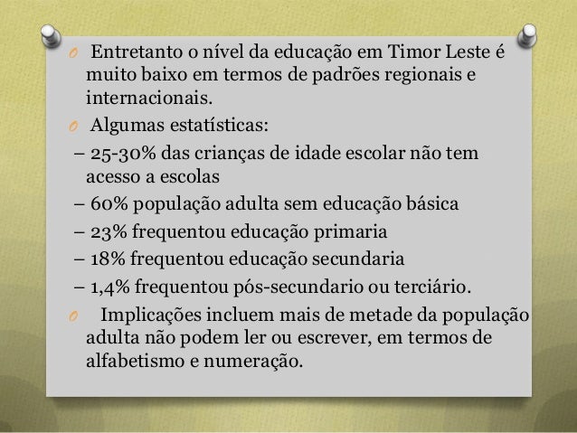 55. 55. O Entretanto o nível da educação em Timor Leste é muito baixo em termos de padrões regionais e internacionais. O Algumas estatísticas: – 25-30% das crianças de idade escolar não tem acesso a escolas – 60% população adulta sem educação básica – 23% frequentou educação primaria – 18% frequentou educação secundaria – 1,4% frequentou pós-secundario ou terciário. O Implicações incluem mais de metade da população adulta não podem ler ou escrever, em termos de alfabetismo e numeração.