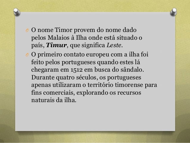 5. 5. O O nome Timor provem do nome dado pelos Malaios à Ilha onde está situado o país, Timur, que significa Leste. O O primeiro contato europeu com a ilha foi feito pelos portugueses quando estes lá chegaram em 1512 em busca do sândalo. Durante quatro séculos, os portugueses apenas utilizaram o território timorense para fins comerciais, explorando os recursos naturais da ilha.
