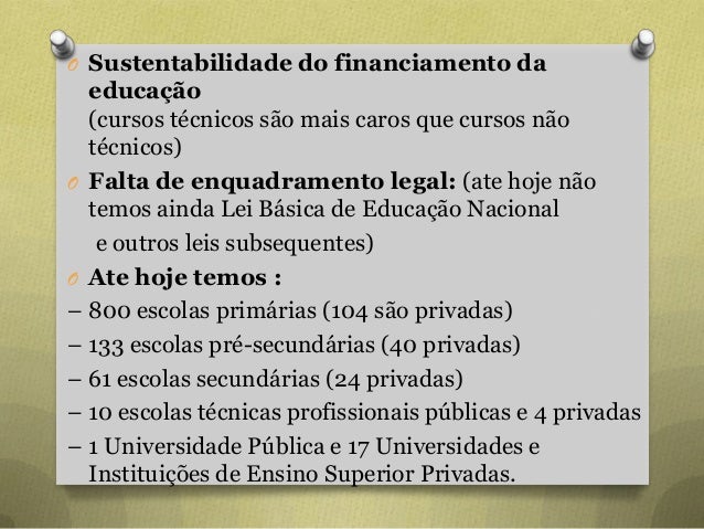 56. 56. O Sustentabilidade do financiamento da educação (cursos técnicos são mais caros que cursos não técnicos) O Falta de enquadramento legal: (ate hoje não temos ainda Lei Básica de Educação Nacional e outros leis subsequentes) O Ate hoje temos : – 800 escolas primárias (104 são privadas) – 133 escolas pré-secundárias (40 privadas) – 61 escolas secundárias (24 privadas) – 10 escolas técnicas profissionais públicas e 4 privadas – 1 Universidade Pública e 17 Universidades e Instituições de Ensino Superior Privadas.