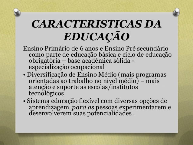 57. 57. CARACTERISTICAS DA EDUCAÇÃO Ensino Primário de 6 anos e Ensino Pré secundário como parte de educação básica e ciclo de educação obrigatória – base acadêmica sólida - especialização ocupacional • Diversificação de Ensino Médio (mais programas orientadas ao trabalho no nível médio) – mais atenção e suporte as escolas/institutos tecnológicos • Sistema educação flexível com diversas opções de aprendizagem para as pessoas experimentarem e desenvolverem suas potencialidades .