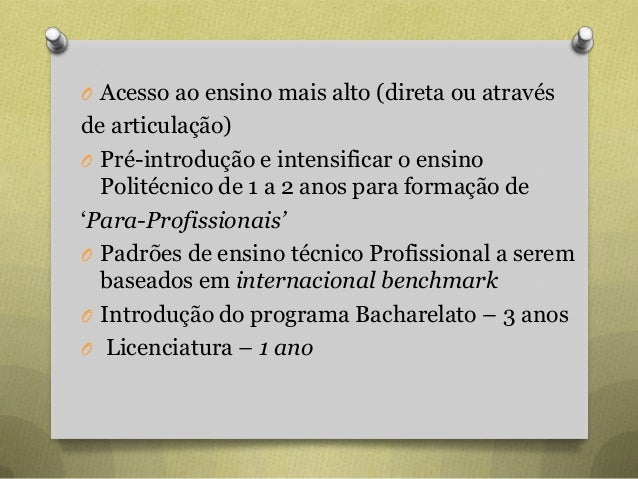 58. 58. O Acesso ao ensino mais alto (direta ou através de articulação) O Pré-introdução e intensificar o ensino Politécnico de 1 a 2 anos para formação de „Para-Profissionais’ O Padrões de ensino técnico Profissional a serem baseados em internacional benchmark O Introdução do programa Bacharelato – 3 anos O Licenciatura – 1 ano