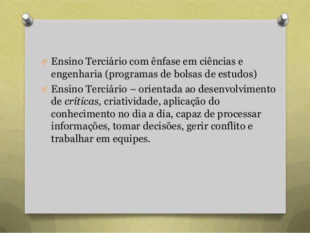 59. 59. O Ensino Terciário com ênfase em ciências e engenharia (programas de bolsas de estudos) O Ensino Terciário – orientada ao desenvolvimento de críticas, criatividade, aplicação do conhecimento no dia a dia, capaz de processar informações, tomar decisões, gerir conflito e trabalhar em equipes.