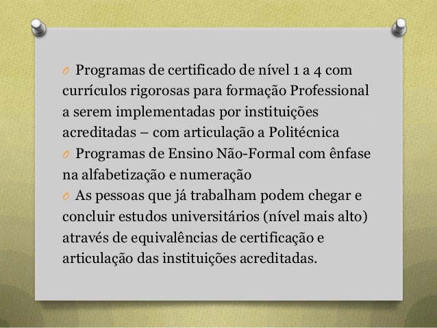60. 60. O Programas de certificado de nível 1 a 4 com currículos rigorosas para formação Professional a serem implementadas por instituições acreditadas – com articulação a Politécnica O Programas de Ensino Não-Formal com ênfase na alfabetização e numeração O As pessoas que já trabalham podem chegar e concluir estudos universitários (nível mais alto) através de equivalências de certificação e articulação das instituições acreditadas.
