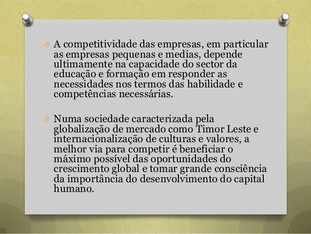 61. 61. O A competitividade das empresas, em particular as empresas pequenas e medias, depende ultimamente na capacidade do sector da educação e formação em responder as necessidades nos termos das habilidade e competências necessárias. O Numa sociedade caracterizada pela globalização de mercado como Timor Leste e internacionalização de culturas e valores, a melhor via para competir é beneficiar o máximo possível das oportunidades do crescimento global e tomar grande consciência da importância do desenvolvimento do capital humano.