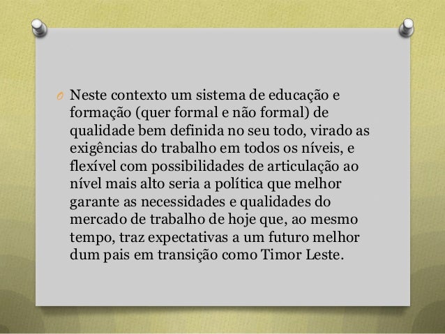 62. 62. O Neste contexto um sistema de educação e formação (quer formal e não formal) de qualidade bem definida no seu todo, virado as exigências do trabalho em todos os níveis, e flexível com possibilidades de articulação ao nível mais alto seria a política que melhor garante as necessidades e qualidades do mercado de trabalho de hoje que, ao mesmo tempo, traz expectativas a um futuro melhor dum pais em transição como Timor Leste.