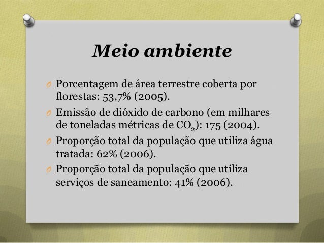 63. 63. Meio ambiente O Porcentagem de área terrestre coberta por florestas: 53,7% (2005). O Emissão de dióxido de carbono (em milhares de toneladas métricas de CO2): 175 (2004). O Proporção total da população que utiliza água tratada: 62% (2006). O Proporção total da população que utiliza serviços de saneamento: 41% (2006).