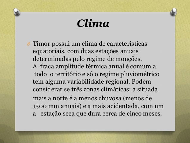 64. 64. Clima O Timor possui um clima de características equatoriais, com duas estações anuais determinadas pelo regime de monções. A fraca amplitude térmica anual é comum a todo o território e só o regime pluviométrico tem alguma variabilidade regional. Podem considerar se três zonas climáticas: a situada mais a norte é a menos chuvosa (menos de 1500 mm anuais) e a mais acidentada, com um a estação seca que dura cerca de cinco meses.