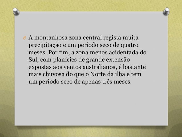 65. 65. O A montanhosa zona central regista muita precipitação e um período seco de quatro meses. Por fim, a zona menos acidentada do Sul, com planícies de grande extensão expostas aos ventos australianos, é bastante mais chuvosa do que o Norte da ilha e tem um período seco de apenas três meses.