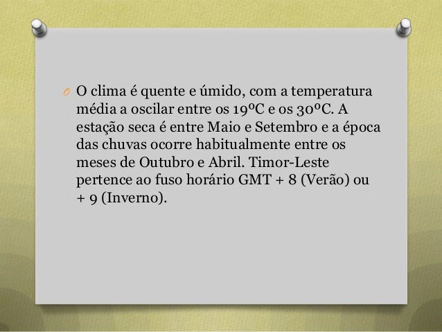 66. 66. O O clima é quente e úmido, com a temperatura média a oscilar entre os 19ºC e os 30ºC. A estação seca é entre Maio e Setembro e a época das chuvas ocorre habitualmente entre os meses de Outubro e Abril. Timor-Leste pertence ao fuso horário GMT + 8 (Verão) ou + 9 (Inverno).
