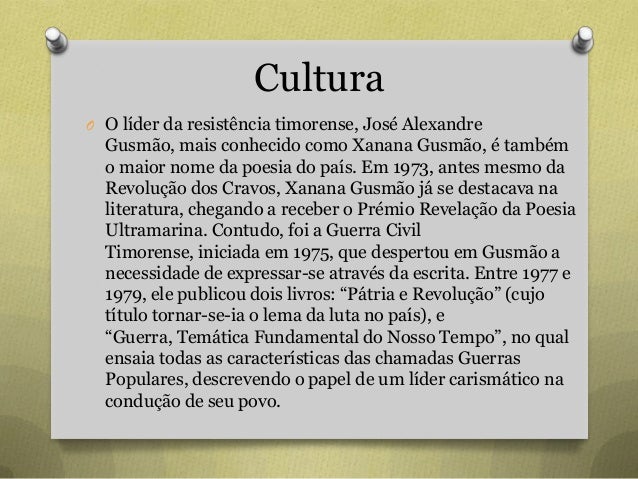 67. 67. Cultura O O líder da resistência timorense, José Alexandre Gusmão, mais conhecido como Xanana Gusmão, é também o maior nome da poesia do país. Em 1973, antes mesmo da Revolução dos Cravos, Xanana Gusmão já se destacava na literatura, chegando a receber o Prémio Revelação da Poesia Ultramarina. Contudo, foi a Guerra Civil Timorense, iniciada em 1975, que despertou em Gusmão a necessidade de expressar-se através da escrita. Entre 1977 e 1979, ele publicou dois livros: “Pátria e Revolução” (cujo título tornar-se-ia o lema da luta no país), e “Guerra, Temática Fundamental do Nosso Tempo”, no qual ensaia todas as características das chamadas Guerras Populares, descrevendo o papel de um líder carismático na condução de seu povo.