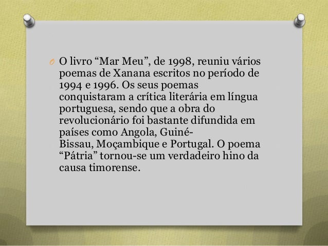68. 68. O O livro “Mar Meu”, de 1998, reuniu vários poemas de Xanana escritos no período de 1994 e 1996. Os seus poemas conquistaram a crítica literária em língua portuguesa, sendo que a obra do revolucionário foi bastante difundida em países como Angola, Guiné- Bissau, Moçambique e Portugal. O poema “Pátria” tornou-se um verdadeiro hino da causa timorense.