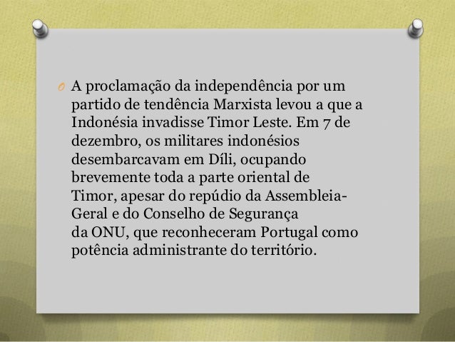 7. 7. O A proclamação da independência por um partido de tendência Marxista levou a que a Indonésia invadisse Timor Leste. Em 7 de dezembro, os militares indonésios desembarcavam em Díli, ocupando brevemente toda a parte oriental de Timor, apesar do repúdio da Assembleia- Geral e do Conselho de Segurança da ONU, que reconheceram Portugal como potência administrante do território.