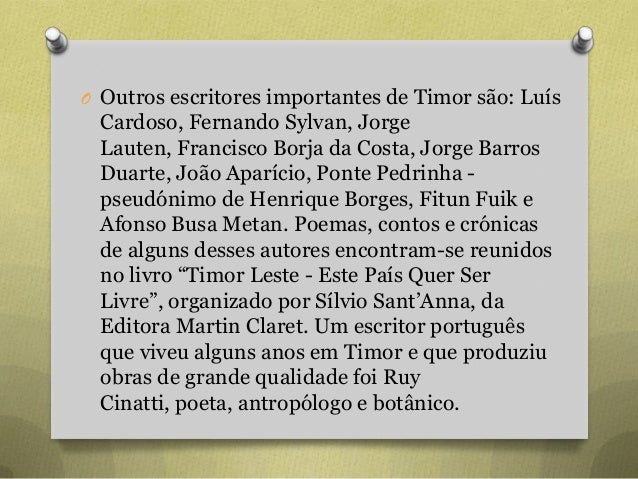 70. 70. O Outros escritores importantes de Timor são: Luís Cardoso, Fernando Sylvan, Jorge Lauten, Francisco Borja da Costa, Jorge Barros Duarte, João Aparício, Ponte Pedrinha - pseudónimo de Henrique Borges, Fitun Fuik e Afonso Busa Metan. Poemas, contos e crónicas de alguns desses autores encontram-se reunidos no livro “Timor Leste - Este País Quer Ser Livre”, organizado por Sílvio Sant‟Anna, da Editora Martin Claret. Um escritor português que viveu alguns anos em Timor e que produziu obras de grande qualidade foi Ruy Cinatti, poeta, antropólogo e botânico.