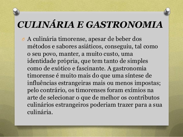 71. 71. CULINÁRIA E GASTRONOMIA O A culinária timorense, apesar de beber dos métodos e sabores asiáticos, conseguiu, tal como o seu povo, manter, a muito custo, uma identidade própria, que tem tanto de simples como de exótico e fascinante. A gastronomia timorense é muito mais do que uma síntese de influências estrangeiras mais ou menos impostas; pelo contrário, os timorenses foram exímios na arte de selecionar o que de melhor os contributos culinários estrangeiros poderiam trazer para a sua culinária.