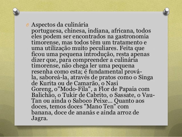 72. 72. O Aspectos da culinária portuguesa, chinesa, indiana, africana, todos eles podem ser encontrados na gastronomia timorense, mas todos têm um tratamento e uma utilização muito peculiares. Feita que ficou uma pequena introdução, resta apenas dizer que, para compreender a culinária timorense, não chega ler uma pequena resenha como esta; é fundamental prová- la, saboreá-la, através de pratos como o Singa de Kurita ou de Camarão, o Nasi Goreng, o"Modo-Fila", a Flor de Papaia com Balichão, o Tukir de Cabrito, o Sassate, o Vau- Tan ou ainda o Saboco Peixe... Quanto aos doces, temos doces "Mano Ten" com banana, doce de ananás e ainda arroz de Jagra.