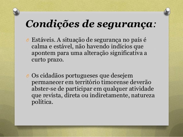 76. 76. Condições de segurança: O Estáveis. A situação de segurança no país é calma e estável, não havendo indícios que apontem para uma alteração significativa a curto prazo. O Os cidadãos portugueses que desejem permanecer em território timorense deverão abster-se de participar em qualquer atividade que revista, direta ou indiretamente, natureza política.