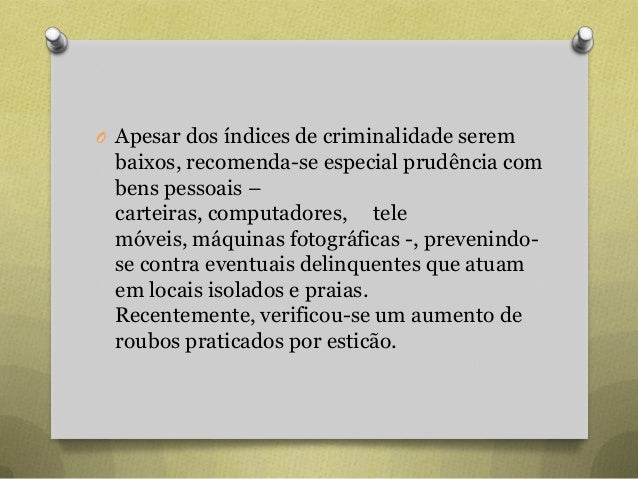 77. 77. O Apesar dos índices de criminalidade serem baixos, recomenda-se especial prudência com bens pessoais – carteiras, computadores, tele móveis, máquinas fotográficas -, prevenindo- se contra eventuais delinquentes que atuam em locais isolados e praias. Recentemente, verificou-se um aumento de roubos praticados por esticão.