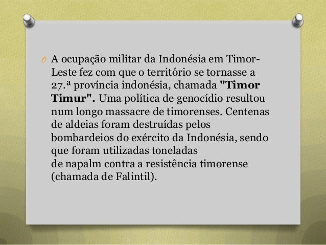 8. 8. O A ocupação militar da Indonésia em Timor- Leste fez com que o território se tornasse a 27.ª província indonésia, chamada "Timor Timur". Uma política de genocídio resultou num longo massacre de timorenses. Centenas de aldeias foram destruídas pelos bombardeios do exército da Indonésia, sendo que foram utilizadas toneladas de napalm contra a resistência timorense (chamada de Falintil).