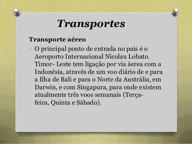 78. 78. Transportes Transporte aéreo O O principal ponto de entrada no país é o Aeroporto Internacional Nicolau Lobato. Timor- Leste tem ligação por via áerea com a Indonésia, através de um voo diário de e para a Ilha de Bali e para o Norte da Austrália, em Darwin, e com Singapura, para onde existem atualmente três voos semanais (Terça- feira, Quinta e Sábado).