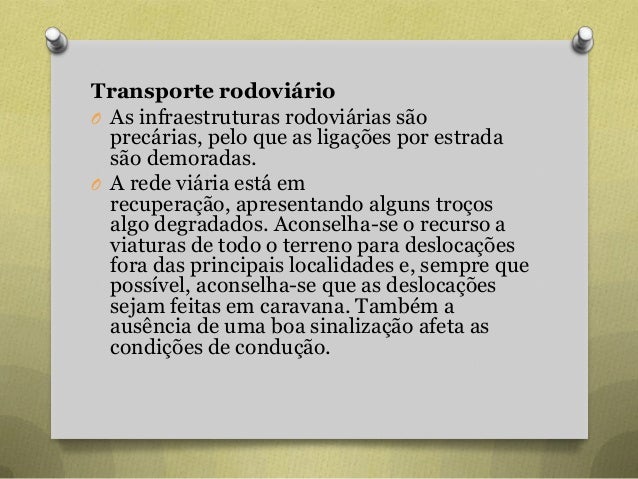 79. 79. Transporte rodoviário O As infraestruturas rodoviárias são precárias, pelo que as ligações por estrada são demoradas. O A rede viária está em recuperação, apresentando alguns troços algo degradados. Aconselha-se o recurso a viaturas de todo o terreno para deslocações fora das principais localidades e, sempre que possível, aconselha-se que as deslocações sejam feitas em caravana. Também a ausência de uma boa sinalização afeta as condições de condução.