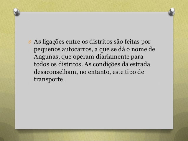 80. 80. O As ligações entre os distritos são feitas por pequenos autocarros, a que se dá o nome de Angunas, que operam diariamente para todos os distritos. As condições da estrada desaconselham, no entanto, este tipo de transporte.