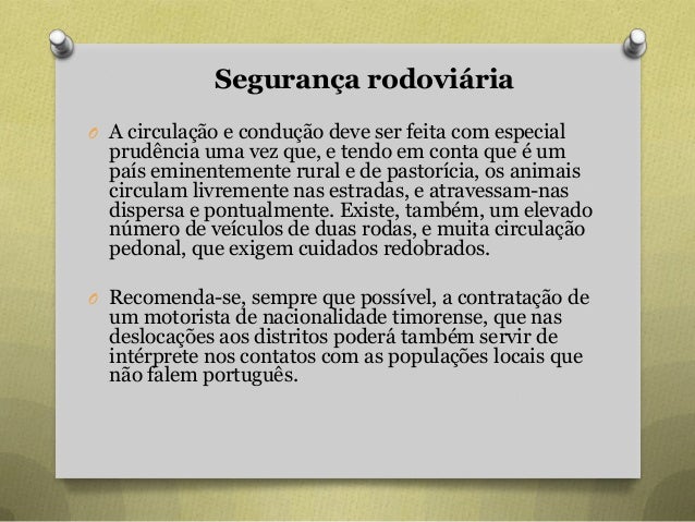 81. 81. Segurança rodoviária O A circulação e condução deve ser feita com especial prudência uma vez que, e tendo em conta que é um país eminentemente rural e de pastorícia, os animais circulam livremente nas estradas, e atravessam-nas dispersa e pontualmente. Existe, também, um elevado número de veículos de duas rodas, e muita circulação pedonal, que exigem cuidados redobrados. O Recomenda-se, sempre que possível, a contratação de um motorista de nacionalidade timorense, que nas deslocações aos distritos poderá também servir de intérprete nos contatos com as populações locais que não falem português.