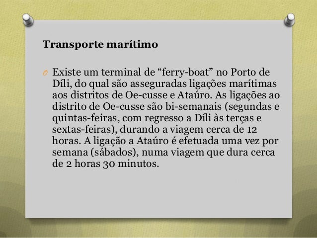 82. 82. Transporte marítimo O Existe um terminal de “ferry-boat” no Porto de Díli, do qual são asseguradas ligações marítimas aos distritos de Oe-cusse e Ataúro. As ligações ao distrito de Oe-cusse são bi-semanais (segundas e quintas-feiras, com regresso a Díli às terças e sextas-feiras), durando a viagem cerca de 12 horas. A ligação a Ataúro é efetuada uma vez por semana (sábados), numa viagem que dura cerca de 2 horas 30 minutos.