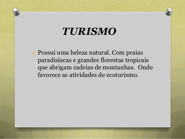 83. 83. TURISMO O Possui uma beleza natural. Com praias paradisíacas e grandes florestas tropicais que abrigam cadeias de montanhas. Onde favorece as atividades de ecoturismo.