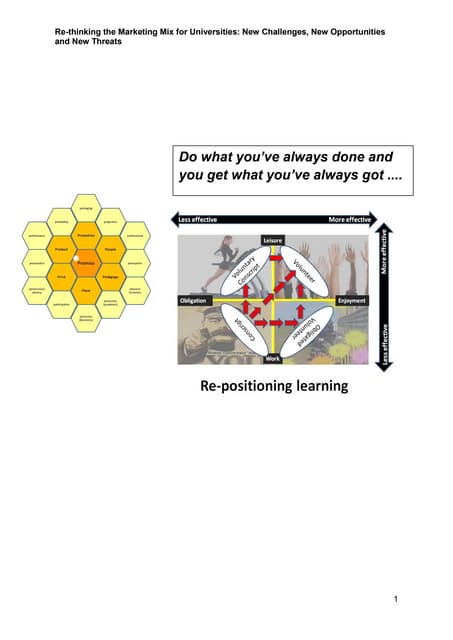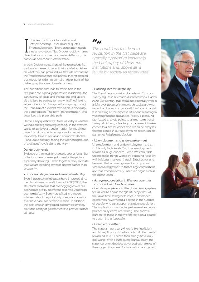 2. 2. 2 www.efmd.org/globalfocus The conditions that lead to revolution in the first place are typically oppressive leadership, the bankruptcy of ideas and institutions and, above all, a failure by society to renew itself I n his landmark book Innovation and Entrepreneurship, Peter Drucker quotes Thomas Jefferson: “Every generation needs a new revolution.” But Drucker quickly makes clear that, as much as he admires Jefferson, this particular comment is off the mark. In truth, Drucker notes, most of the revolutions that we have witnessed in recent history failed to deliver on what they had promised. As Alexis de Tocqueville, the French philosopher and political theorist, pointed out, revolutions do not demolish the prisons of the old regime; they tend to enlarge them. The conditions that lead to revolution in the first place are typically oppressive leadership, the bankruptcy of ideas and institutions and, above all, a failure by society to renew itself. Achieving large-scale social change without going through the upheaval of a violent revolution is obviously the better option. The term “transformation” well describes this preferable path. Hence, a key question that faces us today is whether we have the regenerating capacity in the Western world to achieve a transformation for regaining growth and prosperity as opposed to moving inexorably toward social and economic decline – and, quite possibly, facing the wrenching trauma of a citizens’ revolt along the way. Dangerous trends Evidence of the need for change is strong. A number of factors have converged to make the picture especially daunting. Taken together, they indicate that we are heading towards decline rather than prosperity: • Economic stagnation and financial instability Even though some indicators have improved since the global financial meltdown of 2007/2008, the structural problems that are bogging down our economies are by no means resolved. American economist Larry Summers talked in a recent interview about the probability of secular stagnation as a “base case” for decision makers. In addition the debt crisis in developed economies severely limits the ability of governments to provide further stimulus. • Growing income inequality The French economist and academic Thomas Piketty argues in his much-discussed book, Capital in the 21st Century, that capital has essentially won in a fight over labour. With returns on capital growing faster than the economy overall, the share of capital is increasing at the expense of labour, resulting in widening income disparities. Piketty’s profound fact-based analysis points to a long-term trend. Henry Mintzberg, a leading management thinker, comes to a similar conclusion when he analyses the imbalance in our society in his recent online pamphlet Rebalancing Society. • Unemployment and underemployment Unemployment and underemployment are at stubbornly high levels. Youth unemployment remains a huge concern. Some Western trade unions make things worse by opposing flexibility within labour markets (though Drucker, for one, believed that unions represent an important “countervailing power” to that of large corporations and thus “modern society... needs an organ such as the labour union”). • An ageing population in Western countries combined with low birth rates One billion people around the globe, demographers tell us, will be above the age of 65 by 2035. At the same time, falling birth rates in developed economies have meant a decline in the number of people who can support this older population. The implications for funding retirement and social protection systems are striking. The financial burden for those in the workforce is on a course to becoming unbearable. • Untamed Leviathan The state almost everywhere is big, inefficient and broke, Economist editor John Micklethwaite remarked in 2011. Since then, things have only got worse. With a suffocating bureaucracy, the state too often deprives advanced economies of the oxygen they need for innovation and growth.