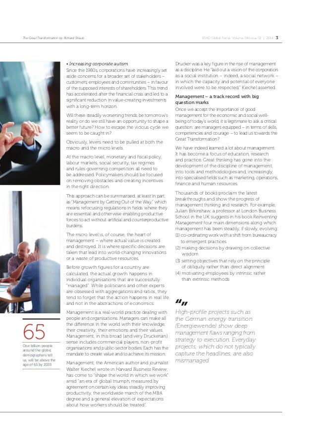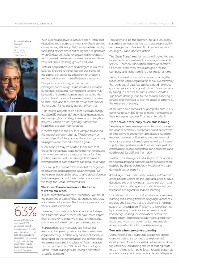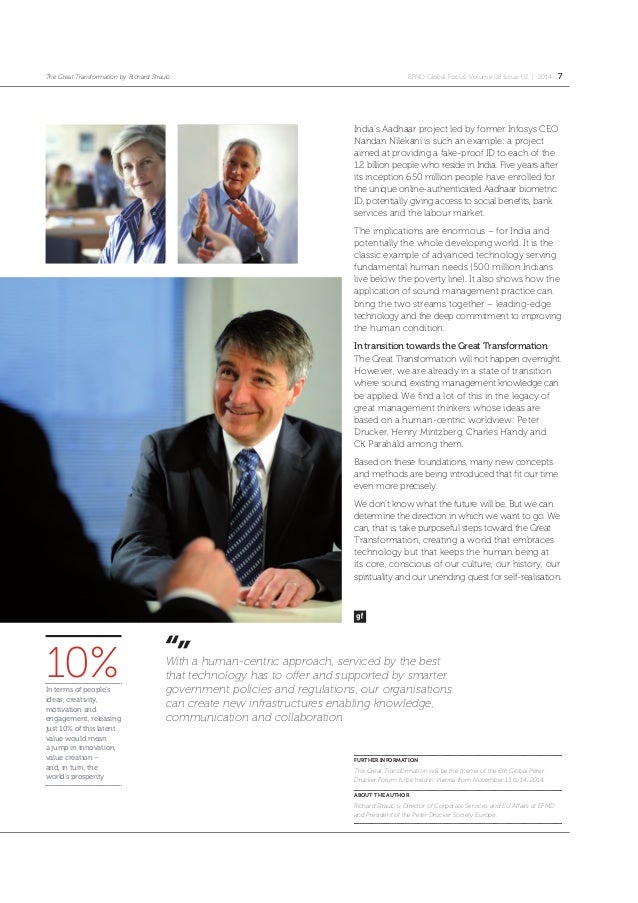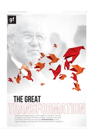 1. 1. EFMD Global Focus: Volume 08 Issue 02 | 2014 1The Great Transformation by Richard Straub We are at the beginning of a set of gigantic changes in society – for better or for worse. The future is open; nobody knows what it will hold. One thing we know says Richard Straub: on this stage, managers will surely be of pivotal importance for shaping it