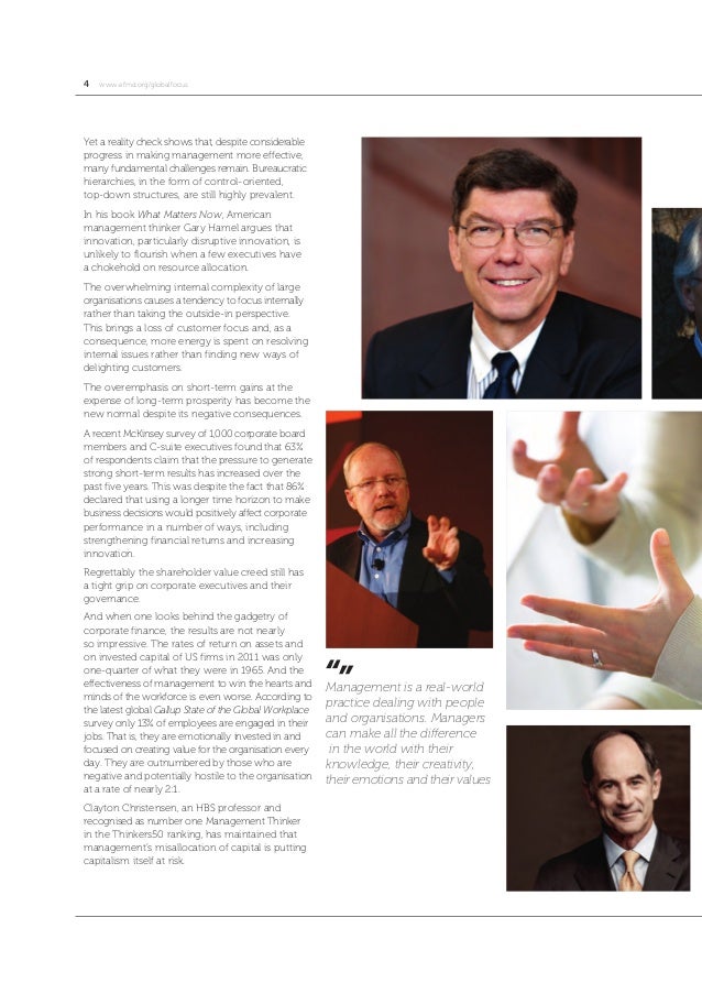 4. 4. 4 www.efmd.org/globalfocus Yet a reality check shows that, despite considerable progress in making management more effective, many fundamental challenges remain. Bureaucratic hierarchies, in the form of control-oriented, top-down structures, are still highly prevalent. In his book What Matters Now, American management thinker Gary Hamel argues that innovation, particularly disruptive innovation, is unlikely to flourish when a few executives have a chokehold on resource allocation. The overwhelming internal complexity of large organisations causes a tendency to focus internally rather than taking the outside-in perspective. This brings a loss of customer focus and, as a consequence, more energy is spent on resolving internal issues rather than finding new ways of delighting customers. The overemphasis on short-term gains at the expense of long-term prosperity has become the new normal despite its negative consequences. A recent McKinsey survey of 1,000 corporate board members and C-suite executives found that 63% of respondents claim that the pressure to generate strong short-term results has increased over the past five years. This was despite the fact that 86% declared that using a longer time horizon to make business decisions would positively affect corporate performance in a number of ways, including strengthening financial returns and increasing innovation. Regrettably the shareholder value creed still has a tight grip on corporate executives and their governance. And when one looks behind the gadgetry of corporate finance, the results are not nearly so impressive. The rates of return on assets and on invested capital of US firms in 2011 was only one-quarter of what they were in 1965. And the effectiveness of management to win the hearts and minds of the workforce is even worse. According to the latest global Gallup State of the Global Workplace survey only 13% of employees are engaged in their jobs. That is, they are emotionally invested in and focused on creating value for the organisation every day. They are outnumbered by those who are negative and potentially hostile to the organisation at a rate of nearly 2:1. Clayton Christensen, an HBS professor and recognised as number one Management Thinker in the Thinkers50 ranking, has maintained that management’s misallocation of capital is putting capitalism itself at risk. Management is a real-world practice dealing with people and organisations. Managers can make all the difference in the world with their knowledge, their creativity, their emotions and their values