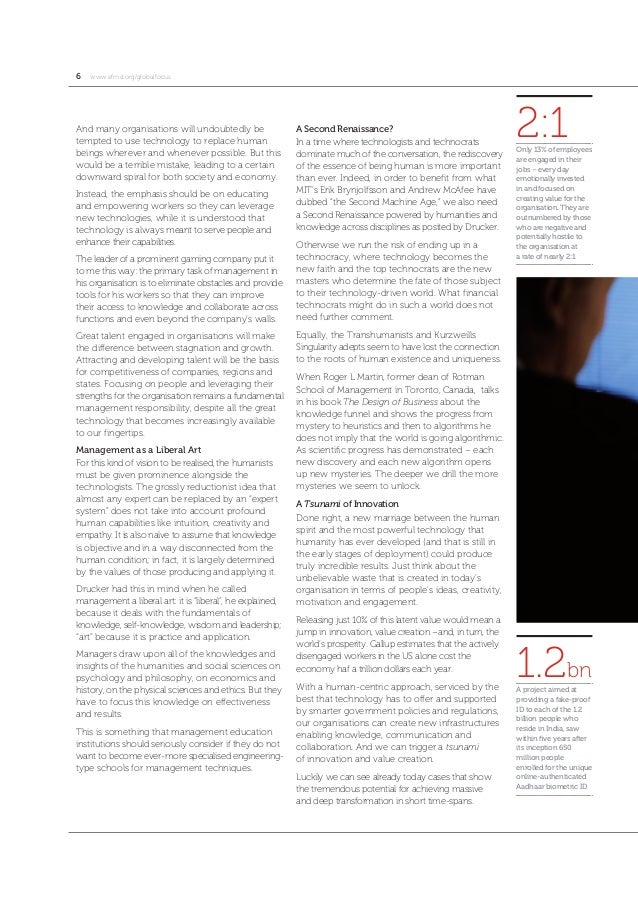 6. 6. 6 www.efmd.org/globalfocus A Second Renaissance? In a time where technologists and technocrats dominate much of the conversation, the rediscovery of the essence of being human is more important than ever. Indeed, in order to benefit from what MIT’s Erik Brynjolfsson and Andrew McAfee have dubbed “the Second Machine Age,” we also need a Second Renaissance powered by humanities and knowledge across disciplines as posited by Drucker. Otherwise we run the risk of ending up in a technocracy, where technology becomes the new faith and the top technocrats are the new masters who determine the fate of those subject to their technology-driven world. What financial technocrats might do in such a world does not need further comment. Equally, the Transhumanists and Kurzweills Singularity adepts seem to have lost the connection to the roots of human existence and uniqueness. When Roger L Martin, former dean of Rotman School of Management in Toronto, Canada, talks in his book The Design of Business about the knowledge funnel and shows the progress from mystery to heuristics and then to algorithms he does not imply that the world is going algorithmic. As scientific progress has demonstrated – each new discovery and each new algorithm opens up new mysteries. The deeper we drill the more mysteries we seem to unlock. A Tsunami of Innovation Done right, a new marriage between the human spirit and the most powerful technology that humanity has ever developed (and that is still in the early stages of deployment) could produce truly incredible results. Just think about the unbelievable waste that is created in today’s organisation in terms of people’s ideas, creativity, motivation and engagement. Releasing just 10% of this latent value would mean a jump in innovation, value creation –and, in turn, the world’s prosperity. Gallup estimates that the actively disengaged workers in the US alone cost the economy haf a trillion dollars each year. With a human-centric approach, serviced by the best that technology has to offer and supported by smarter government policies and regulations, our organisations can create new infrastructures enabling knowledge, communication and collaboration. And we can trigger a tsunami of innovation and value creation. Luckily we can see already today cases that show the tremendous potential for achieving massive and deep transformation in short time-spans. 1.2bn A project aimed at providing a fake-proof ID to each of the 1.2 billion people who reside in India, saw within five years after its inception 650 million people enrolled for the unique online-authenticated Aadhaar biometric ID And many organisations will undoubtedly be tempted to use technology to replace human beings wherever and whenever possible. But this would be a terrible mistake, leading to a certain downward spiral for both society and economy. Instead, the emphasis should be on educating and empowering workers so they can leverage new technologies, while it is understood that technology is always meant to serve people and enhance their capabilities. The leader of a prominent gaming company put it to me this way: the primary task of management in his organisation is to eliminate obstacles and provide tools for his workers so that they can improve their access to knowledge and collaborate across functions and even beyond the company’s walls. Great talent engaged in organisations will make the difference between stagnation and growth. Attracting and developing talent will be the basis for competitiveness of companies, regions and states. Focusing on people and leveraging their strengths for the organisation remains a fundamental management responsibility, despite all the great technology that becomes increasingly available to our fingertips. Management as a Liberal Art For this kind of vision to be realised, the humanists must be given prominence alongside the technologists. The grossly reductionist idea that almost any expert can be replaced by an “expert system” does not take into account profound human capabilities like intuition, creativity and empathy. It is also naïve to assume that knowledge is objective and in a way disconnected from the human condition; in fact, it is largely determined by the values of those producing and applying it. Drucker had this in mind when he called management a liberal art: it is “liberal”, he explained, because it deals with the fundamentals of knowledge, self-knowledge, wisdom and leadership; “art” because it is practice and application. Managers draw upon all of the knowledges and insights of the humanities and social sciences on psychology and philosophy, on economics and history, on the physical sciences and ethics. But they have to focus this knowledge on effectiveness and results. This is something that management education institutions should seriously consider if they do not want to become ever-more specialised engineering- type schools for management techniques. 2:1Only 13% of employees are engaged in their jobs – every day emotionally invested in and focused on creating value for the organisation. They are outnumbered by those who are negative and potentially hostile to the organisation at a rate of nearly 2:1