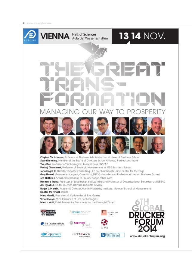 8. 8. 8 www.efmd.org/globalfocus 13I14 NOV.Hall of Sciences Aula der WissenschaftenVIENNA www.druckerforum.org Clayton Christensen, Professor of Business Administration at Harvard Business School Steve Denning, Member of the Board of Directors Scrum Alliance, Forbes contributor Yves Doz, Professor of Technological Innovation at INSEAD Pankaj Ghemawat, Professor of Strategic Management at IESE Business School John Hagel III, Director Deloitte Consulting LLP, Co-Chairman Deloitte Center for the Edge Gary Hamel, Management expert, Consultant, MIX Co-founder and Professor at London Business School Jeff Hoffman, Serial entrepreneur, Co-founder of priceline.com Herminia Ibarra, Professor of Leadership and Learning and Professor of Organisational Behaviour at INSEAD Adi Ignatius, Editor-in-chief, Harvard Business Review Roger L. Martin, Academic Director, Martin Prosperity Institute, Rotman School of Management Nilofer Merchant, Writer Marc Merrill, President Co-founder of Riot Games Vineet Nayar, Vice Chairman of HCL Technologies Martin Wolf, Chief Economics Commentator, the Financial Times MANAGING OUR WAY TO PROSPERITY