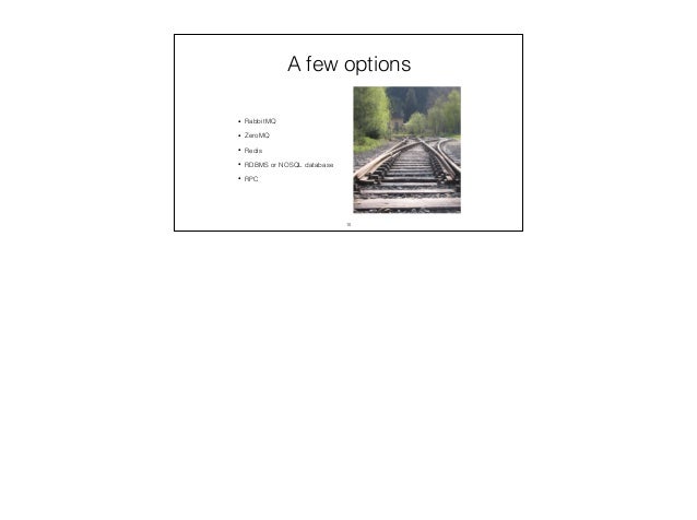 10. 10. A few options • RabbitMQ • ZeroMQ • Redis • RDBMS or NOSQL database • RPC 10