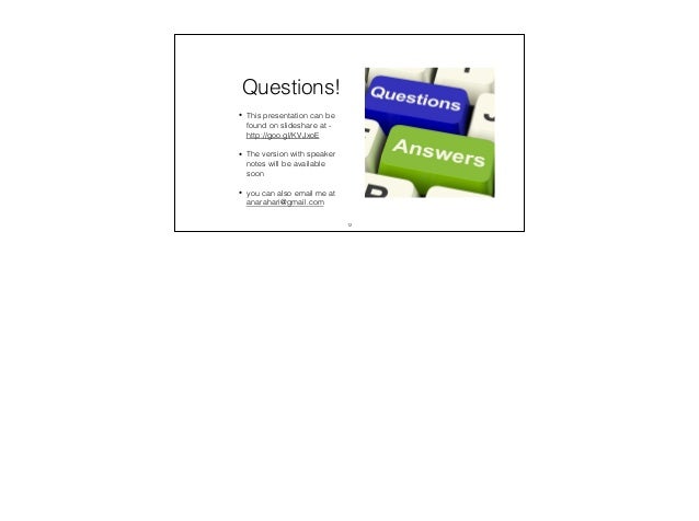 12. 12. Questions! • This presentation can be found on slideshare at - http://goo.gl/KVJxoE ! • The version with speaker notes will be available soon ! • you can also email me at anarahari@gmail.com 12