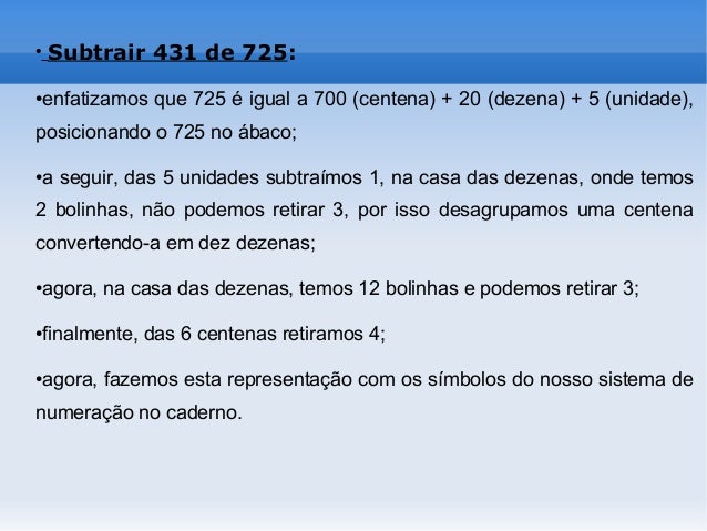 10. 10. ● Subtrair 431 de 725: ●enfatizamos que 725 é igual a 700 (centena) + 20 (dezena) + 5 (unidade), posicionando o 725 no ábaco; ●a seguir, das 5 unidades subtraímos 1, na casa das dezenas, onde temos 2 bolinhas, não podemos retirar 3, por isso desagrupamos uma centena convertendo-a em dez dezenas; ●agora, na casa das dezenas, temos 12 bolinhas e podemos retirar 3; ●finalmente, das 6 centenas retiramos 4; ●agora, fazemos esta representação com os símbolos do nosso sistema de numeração no caderno.