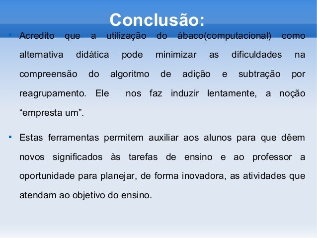 11. 11. Conclusão:  Acredito que a utilização do ábaco(computacional) como alternativa didática pode minimizar as dificuldades na compreensão do algoritmo de adição e subtração por reagrupamento. Ele nos faz induzir lentamente, a noção “empresta um”.  Estas ferramentas permitem auxiliar aos alunos para que dêem novos significados às tarefas de ensino e ao professor a oportunidade para planejar, de forma inovadora, as atividades que atendam ao objetivo do ensino.