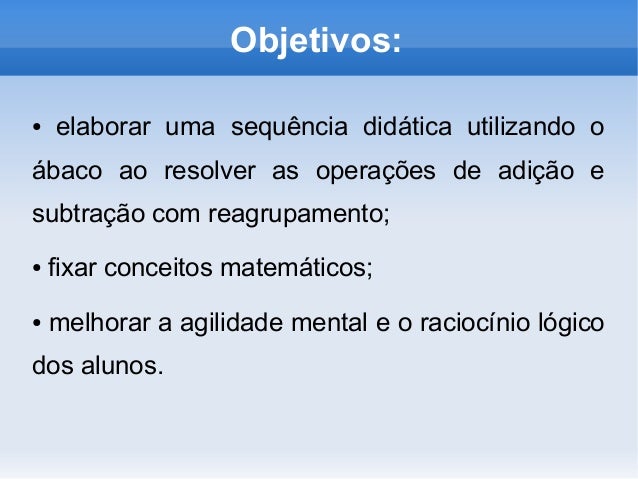 3. 3. Objetivos: ● elaborar uma sequência didática utilizando o ábaco ao resolver as operações de adição e subtração com reagrupamento; ● fixar conceitos matemáticos; ● melhorar a agilidade mental e o raciocínio lógico dos alunos.