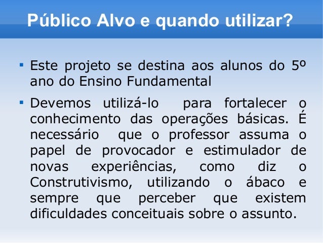 4. 4. Público Alvo e quando utilizar?  Este projeto se destina aos alunos do 5º ano do Ensino Fundamental  Devemos utilizá-lo para fortalecer o conhecimento das operações básicas. É necessário que o professor assuma o papel de provocador e estimulador de novas experiências, como diz o Construtivismo, utilizando o ábaco e sempre que perceber que existem dificuldades conceituais sobre o assunto.