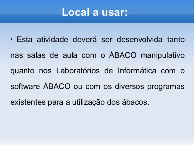 5. 5. Local a usar: ● Esta atividade deverá ser desenvolvida tanto nas salas de aula com o ÁBACO manipulativo quanto nos Laboratórios de Informática com o software ÁBACO ou com os diversos programas existentes para a utilização dos ábacos.