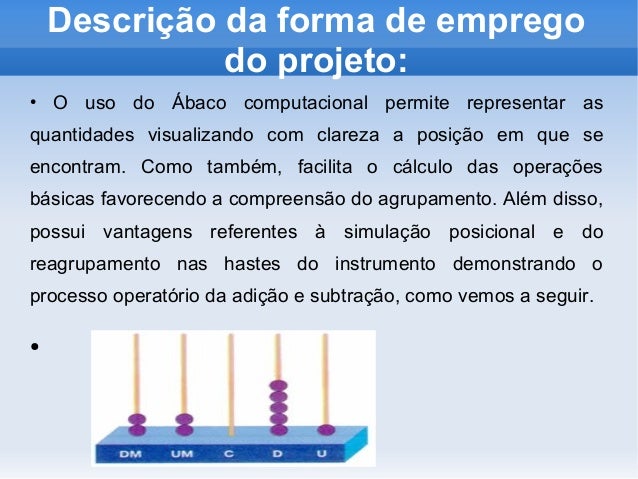 6. 6. Descrição da forma de emprego do projeto: ● O uso do Ábaco computacional permite representar as quantidades visualizando com clareza a posição em que se encontram. Como também, facilita o cálculo das operações básicas favorecendo a compreensão do agrupamento. Além disso, possui vantagens referentes à simulação posicional e do reagrupamento nas hastes do instrumento demonstrando o processo operatório da adição e subtração, como vemos a seguir. ●
